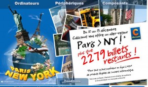 Si vous avez besoin de materiel informatique et avez envie d’aller faire un tour à New York , il peut etre interessant d’etudier l’offre proposée ce week end par Cdiscount : En effet du 10 au 13 decembre pour 450 euros d’achats informatiques (sur des produits signalés) , vous aurez droit à un billet Paris – NewYork .