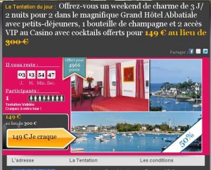 Envie d’un week end en amoureux en Bretagne ? Profitez jusqu’au 23 mars, pour 149 euros d’un bon donnant droit à un séjour de 2 nuits avec petits déjeuners au Grand Hotel Abbatiale de Benodet . Hotel 3 étoiles . 1 bouteille de champagne est de plus offerte ..
