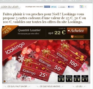 Ce qu’il y a d’interessant , c’est que lookingo propose actuellement jusqu’au 9 decembre d’acheter des cartes cadeaux valables pour des achats de deals sur son site .. ces cartes cadeaux etant vendues à prix reduits :