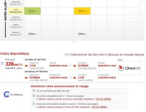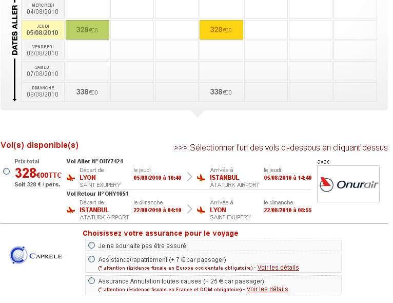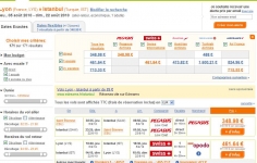 un vol Lyon – Istanbul du 05 au 22 aout, le prix le plus bas proposé par Lilligo est de 461€ (il propose egalement un vol à 348.98 en partant de saint étienne à 40kms de Lyon)
