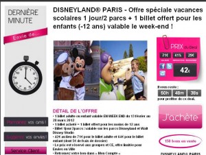 Tres bonne affaire si vous desirez aller à disneyland avec vos enfants dans les prochaines semaines : sur le site envieenville sont en vente des billets à prix tres interessants : 42 euros le billet adulte + le billet enfant valables tous les week end jusqu’au 28 mars 2012