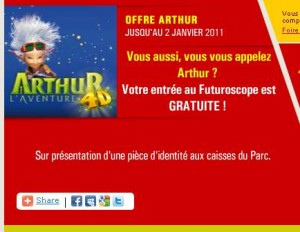 Avec sa nouvelle Animation « Arthur l’aventure 4D » , le futuroscope de POITIER offre l’entrée gratuite au parc pour toutes les personnes qui s’appellent ARTHUR (en nom , prenom …)