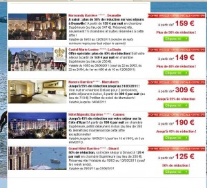 A Deauville , séjour au Normandy Barriere à partir de 159 euros la nuit , à La Baule au Castel Marie Louise séjour à partir de 149 euros , au Majestic à Cannes à partir de 199 euros , au Grand Hotel Barriere à Dinard à partir de 125 euros et au Naoura Barriere de Marrakech à partir de 309 euros la nuit ..