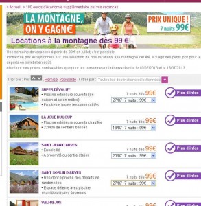 Moins de 100 euros la semaine de vacances en location à la montagne .. C’est ce qu’affiche le site madame vacances pour plusieurs résidences pour une arrivée les 20 et 27 juillet 2013 .. En fait le prix est un peu plus élevé car il faut ajouter les frais de dossier mais en utilisant le code réduction « MV5 » le prix total à payer est de 103 euros 50 ..