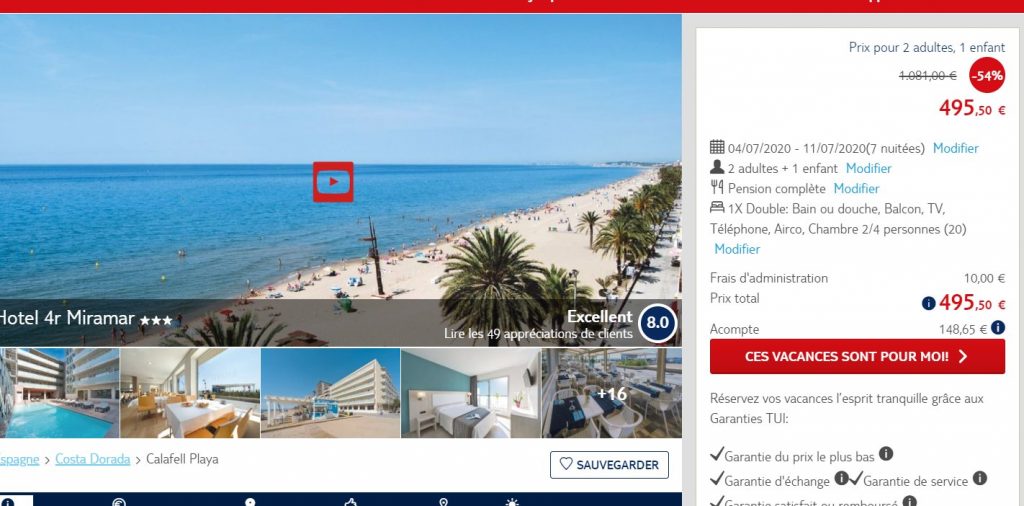 Sur le site belge tui.be (le nouveau nom de jetair ) , on peut donc reserver pour 2 adultes + 1 enfant pour 495 euros seulement en Pension Complete dans l’hotel miramar 4 etoiles se trouvant sur la Costa Dorada …