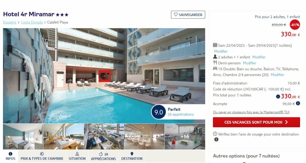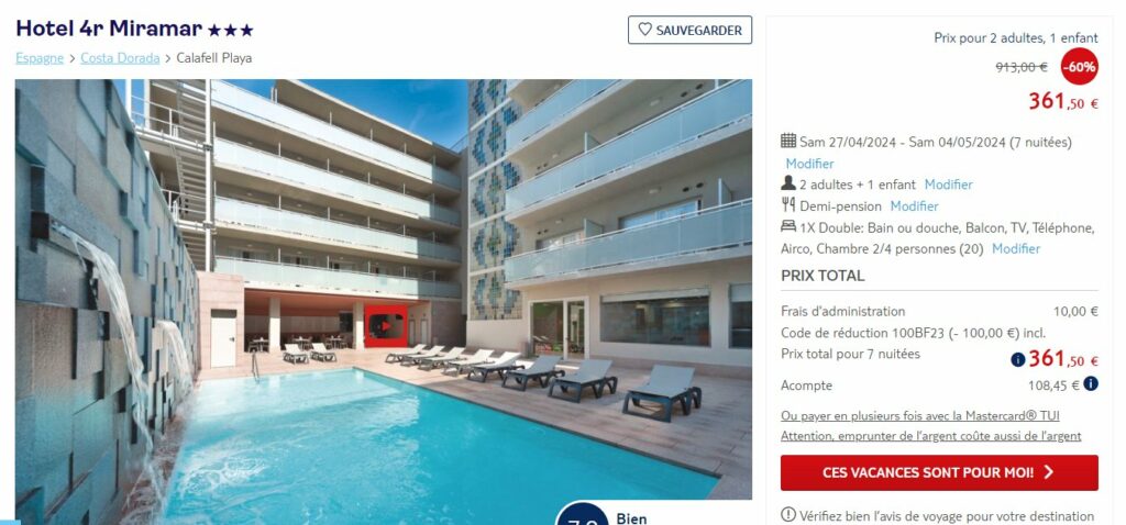 Avec sur TUI.BE (anciennement jetair.be ) un bon prix pour une semaine en demi pension dans l’hotel MIRAMAR 3 etoiles se trouvant en Espagne à Calafell ..