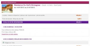Il faut selectionner en bas de la page  la villa 3 pieces cabine 8 personnes avec piscine privee .. et saisir dans la page avant le paiement, le code promo « FRANCE »