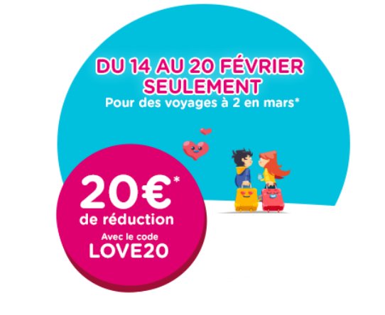 Jusqu’au 20 fevrier , on peut bénéficier en effet de 20€ de remise sur un voyage à 2 adultes , se deroulant entre le 7 mars et le 7 avril , en utilisant le code de réduction « LOVE20 »
