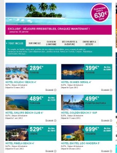 Le site voyagesncf propose une offres promo du 24 au 30 janvier 2012 avec des séjours à des prix tres interessants : ainsi le séjour en Tunisie en tout inclus au depart de Paris le 10 mars est à 289 euros . Le séjour à Fuerteventura en tout inclu aussi au depart de paris les 11 et 25 mars sont à 499 euros .. Madere à 699 en all inclusive depart le 25 mars .. la croisiere sur le nil à 379 euros depart de paris le 10 mars …