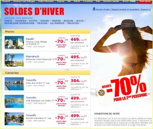 Ainsi chez Thomas Cook , les soldes se présentent sous la forme de remise allant jusqu’à 70% sur la deuxieme personne et cela permet d’obtenir sur certains séjours des prix très très intéressants voire exceptionnels: