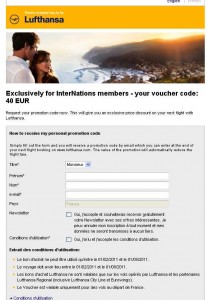 https://promotion.lufthansa.com/int2011/?lid=fr puis de saisir ses coordonnées . Vous recevrez alors sous quelques minutes par email , un code de réduction de 40 euros à utiliser sur le site Lufthansa .
