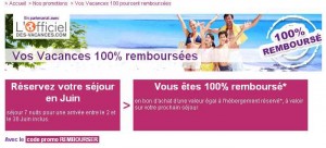 Sur madamevacances, en effet, il y a une offre 100% remboursée pour une semaine de location en juin 2012: il faut pour cela effectuer sa réservation d’ici le 29 avril et saisir le code promo « REMBOURSER » .