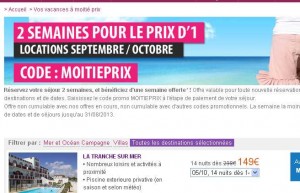 Bonne affaire pour aller en vacances en France en septembre ou octobre … Sur le site madame vacances, il y a une promo « 2 semaines pour le prix d’une » concernant des séjours en location à la mer , ocean et campagne .. Pour les mois de septembre et d’octobre 2013..
