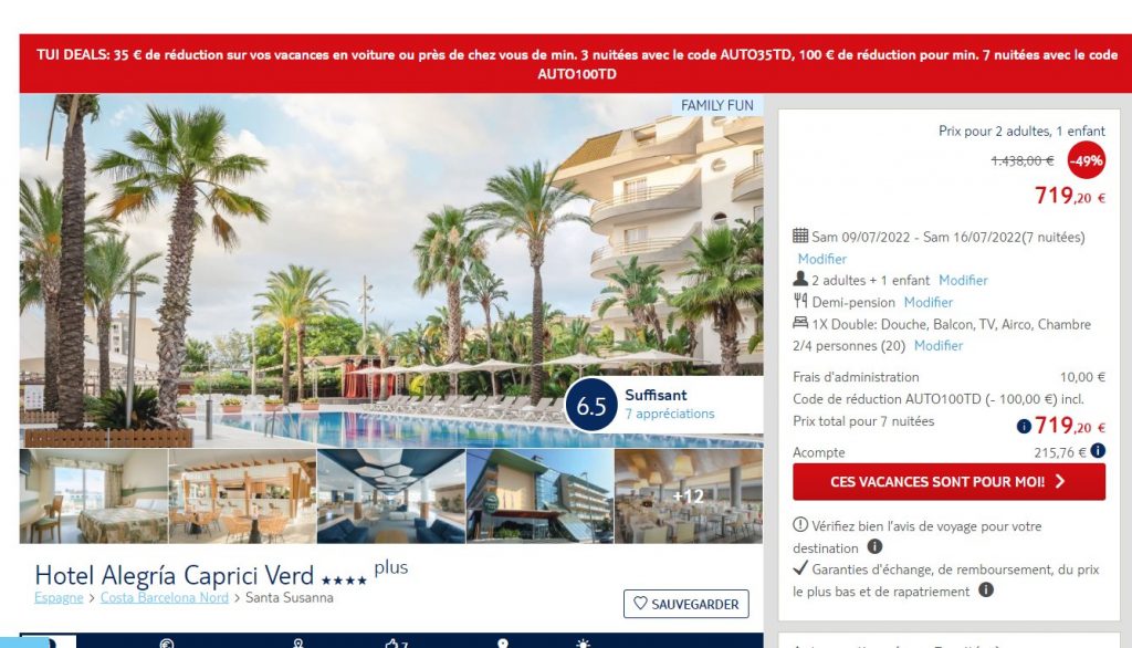 Sur le site belge tui.be (le nouveau nom de jetair ) , on peut donc reserver pour 2 adultes + 1 enfant de moins de 13 ans , pour les arrivées du mois de juillet le 9 et 16 juillet , pour un prix de 719€ … dans l’hotel ALEGRIA CAPRICI VERD 4 etoiles sup en demi pension …