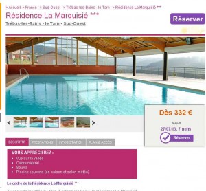 Envie d’aller en vacances à la campagne ? Sur le site des residences madame vacances, on a une location dans le Tarn à proximité d’Albi à 340 euros pour une arrivée le 27 juillet .. Pour une arrivée le 3 aout c’est 410 euros avec les frais de dossier ..
