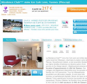 Vacances en résidence club à Vannes: 251€ le studio 2 adultes, 402 l’appartement 2 adultes et 2 enfants .. 2 premieres semaines de juillet