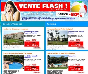 un bon plan location pour ces vacances d’été : en effet sur promovacances, une vente flash à lieu jusqu’au 25 mai dans laquelle on trouve des offres pour ainsi dire exceptionnelles: ainsi une location dans une maisonnette pour 4 personnes en camargue la semaine du 13 aout .. à seulement 426 euros (au lieu de 710) .. et des prix encore plus bas en juillet (294 euros la semaine du 2 juillet par exemple) .. et dans une residence disposant d’une piscine couverte chauffee ..