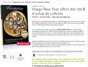 Actuellement sur le site wonderbox , pour l’achat d’un ou plusieurs coffrets cadeaux d’une valeur totale de plus de 100 euros , un coffret cadeau « happy new year » est offert ..